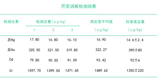 本試驗采用的石墨消解儀硝酸濕法消解方式,僅需1次前處理方法,可以同時檢測鎘、鉻、汞和砷4種重金屬元素,操作簡便,試劑耗材消耗量少,石墨消解儀消解芹菜,節(jié)約了成本,具有批處理量大且無需實驗人員值守的優(yōu)點,安全性系數(shù)高,一般性實驗室均可采用。本實驗只用硝酸硝解樣品,對樣品進行預(yù)消解處理,安全系數(shù)高,樣品空白成分簡單,空白值低。