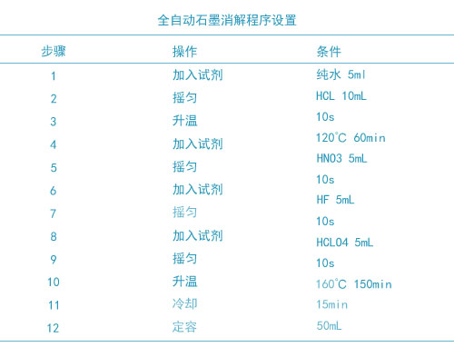 本次試驗(yàn)使用HCl-HNO3-HF-HClO4混合酸消解體系,將土壤中的晶格全部打開,進(jìn)行全消解。因用酸量較少,只需準(zhǔn)確稱取0.1000-0.2000g左右干燥土壤樣品至特氟龍消解管中,放入全自動消解儀石墨孔中,設(shè)置好系統(tǒng)消解方法只需要一鍵啟動就可以自動加酸、搖勻、加熱消解、趕酸、定容。全自動石墨消解儀系統(tǒng)的消解程序及條件見表下面表格。全自動消解儀自動定容到50mL,每批樣品加做雙份全程序空白。