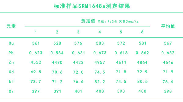 將石英纖維濾膜剪碎置于消解管中,全自動消解儀取整張濾膜,準確稱量0.03g城市可吸入顆粒物標準樣品SRMl648a加入每個濾膜樣品,分別按照上述消解條件進行消解,每種消解方式制備6組樣品,同時做空白實驗。測定結果見表。