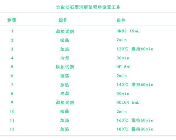 將整張石英纖維濾膜剪碎后置于聚四氟乙烯消解管中,再將消解管放進全自動消解儀石墨孔中,按設定的消解程序(見全自動石墨消解儀消解程序設置工步表)進行消解,消解完成(蒸至內容物呈粘稠狀或半固體的滾動狀態)后,用1%HNO3溶解,用水洗滌、轉移并定容至25mL比色管中,搖勻待測。同時做全程序空白實驗。