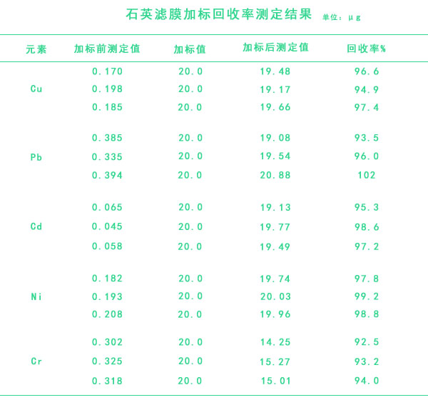將整張石英纖維濾膜剪碎置于消解管中,準確移取2.0mL加標測定回收率,分別按照上述消解條件進行消解。同時做空白實驗。制備3組樣品,測定結果見表。