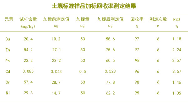 采用實驗室電熱板消解土壤標準樣品ESS-1結果可以看出,測定結果與標準樣品的推薦值較吻合,說明其準確度高、結果可靠;多元素的加標回收率在95%~98%之間,符合土壤重金屬含量分析的質量要求。